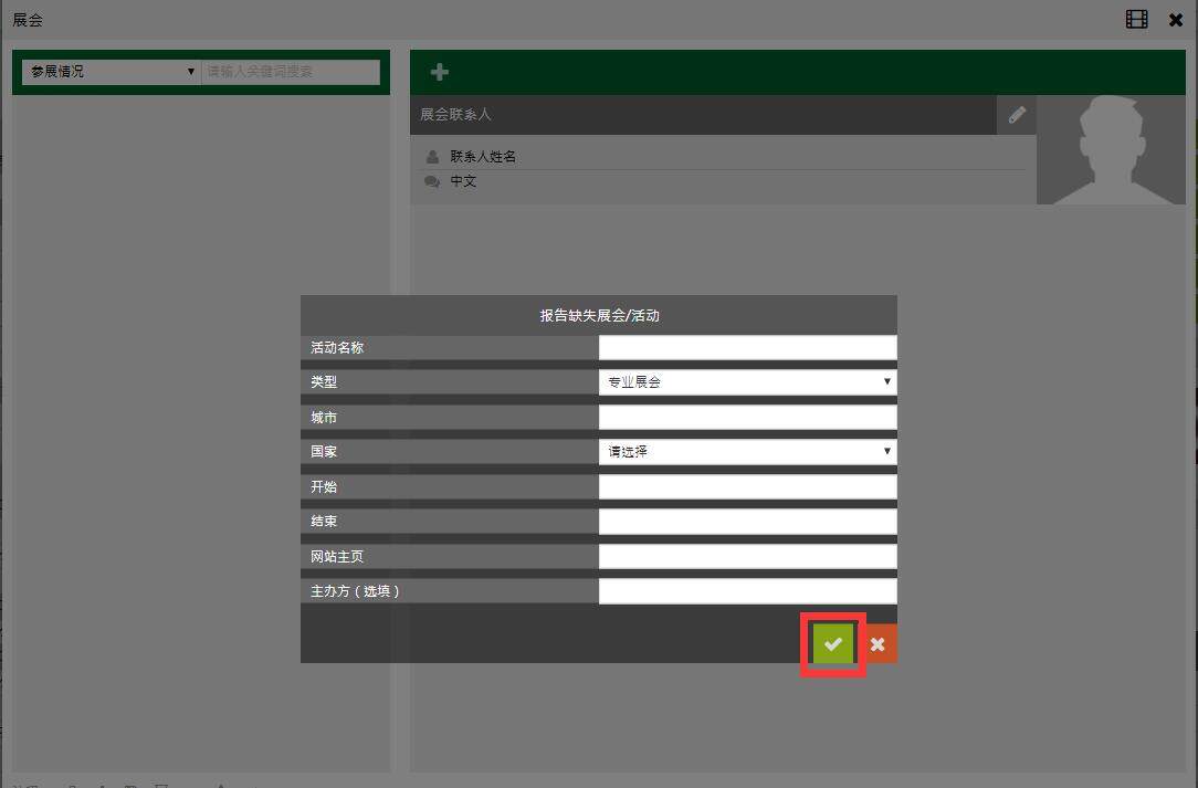 点击【√】,系统将有关缺失展会邮件发送至Industrystock后台,以上信息填写无误后,提示“邮件发送成功”,系统收到邮件48h内处理问题。