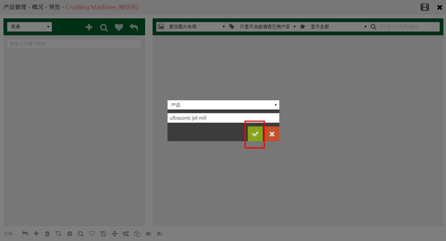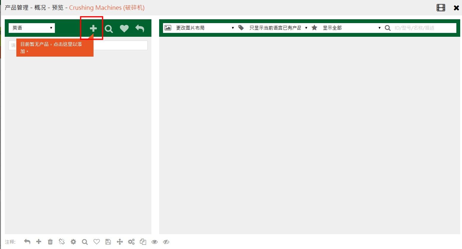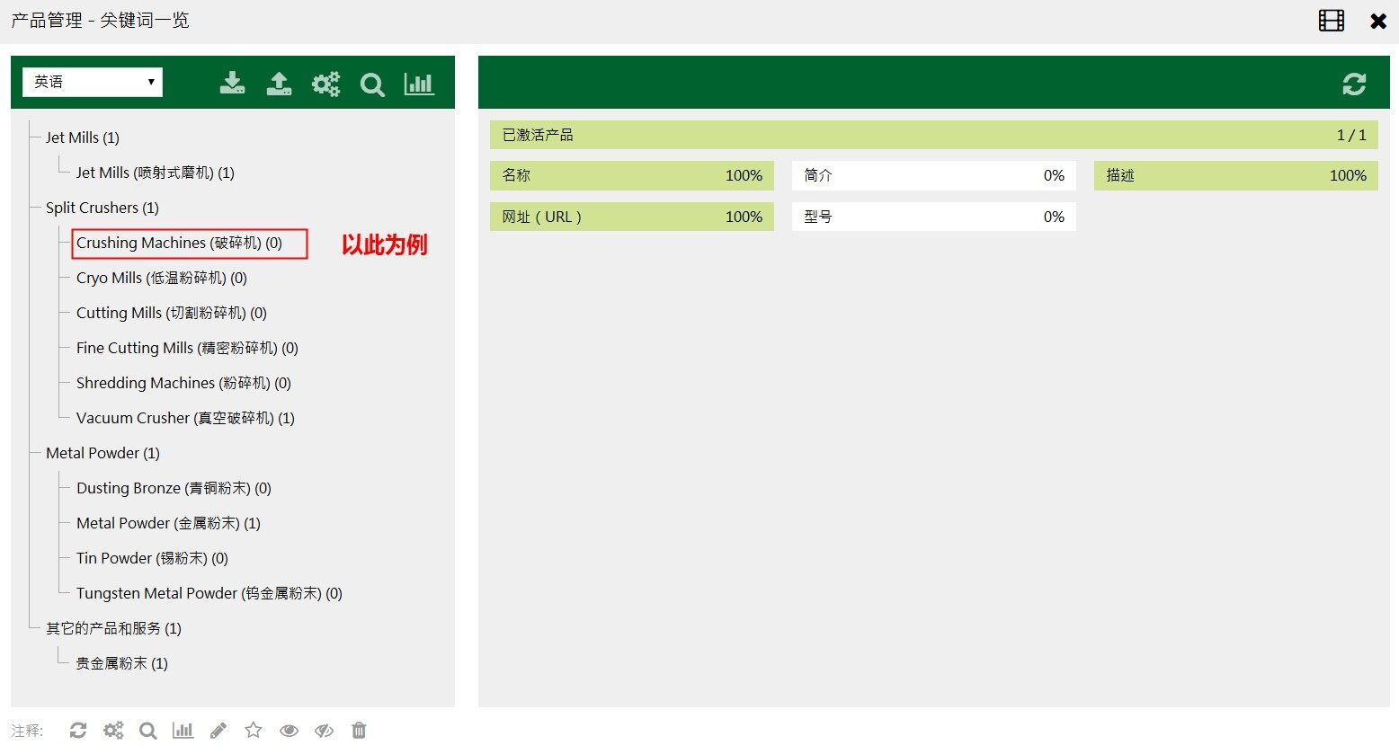 弹出“产品管理-概况-细节管理-Crushing Machines(破碎机),进入产品信息编辑步骤。