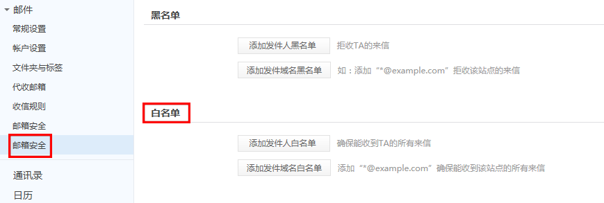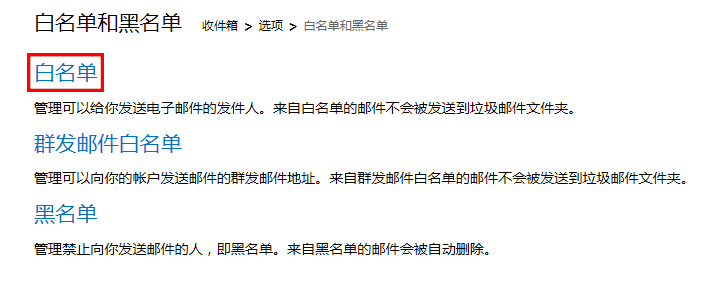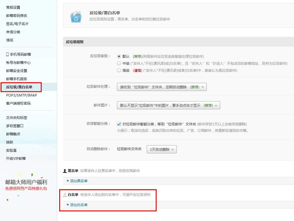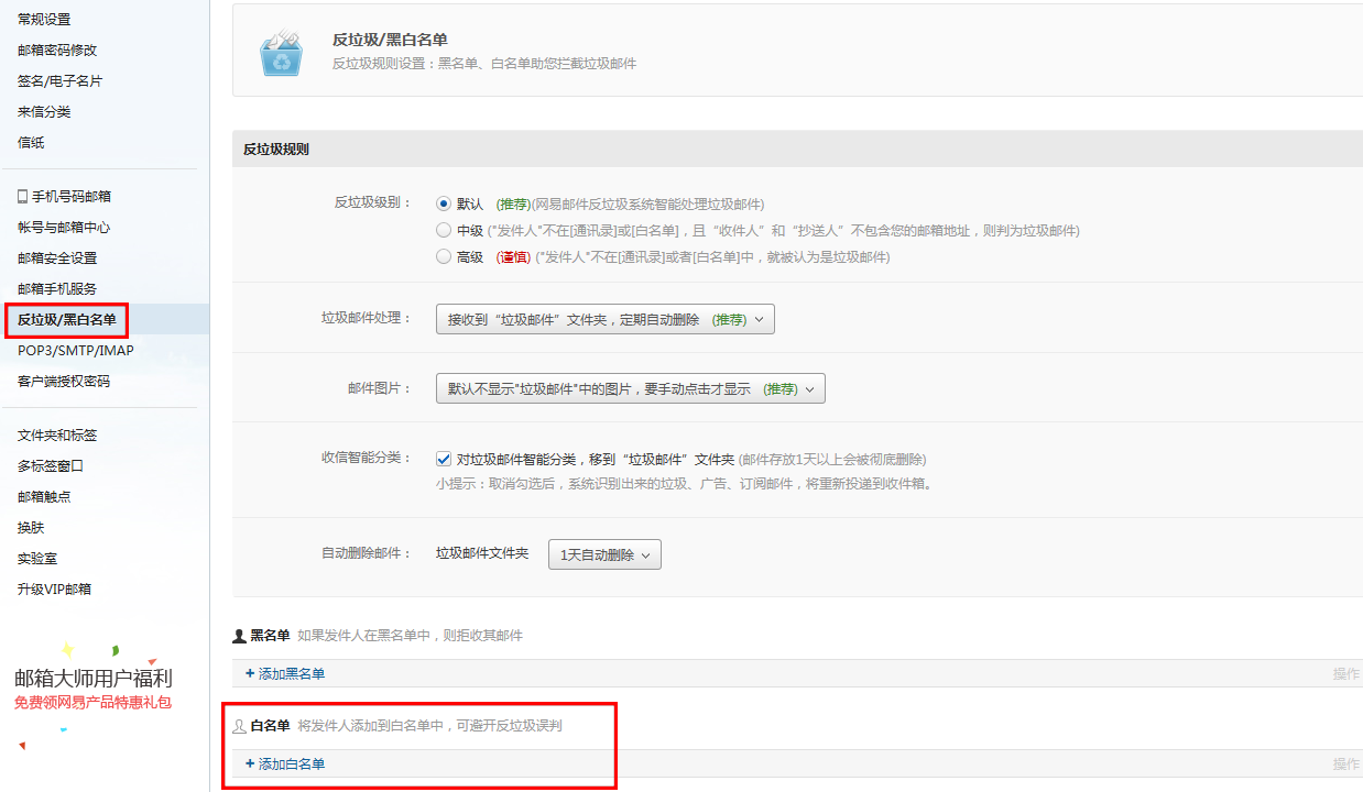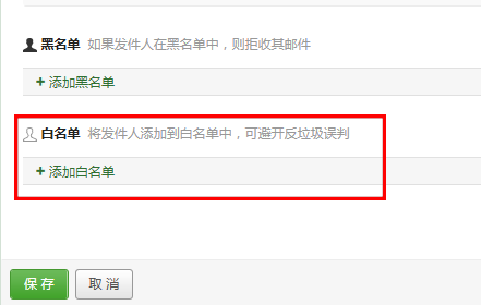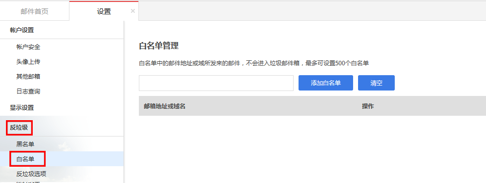 2、在邮箱设置-反垃圾/黑白名单中点击”添加白名单”;
