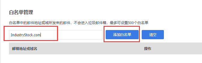 3、在输入框中输入”IndustryStock.com或IndustryStock.cn”后点击”添加白名单”;