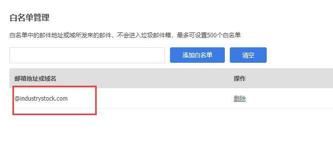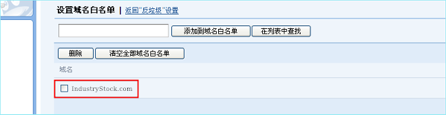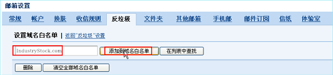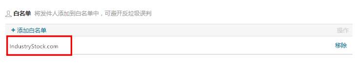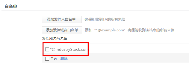 | 有部分用户反映IndustryStock的邮件进入了垃圾箱或者未收到。这一方面是由于IndustryStock发出的邮件较多,另一方面,某些邮箱的反垃圾的过滤规则设置问题。所以为保证用户能够100%收到来自IndustryStock的邮件(如客户询盘,内部沟通邮件,系统消息等),请将如下域名加入白名单。 | |