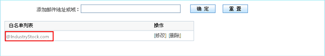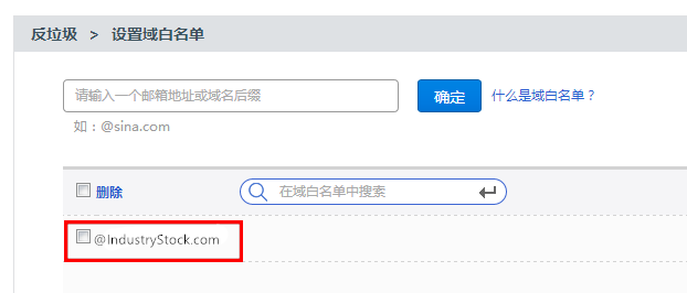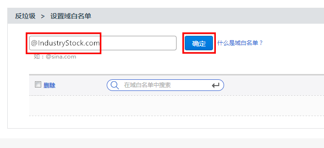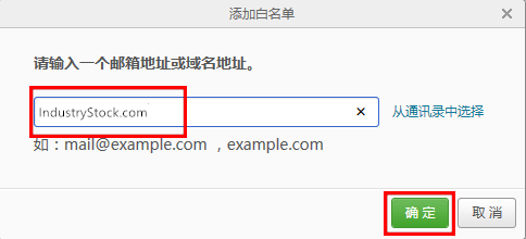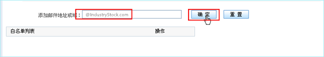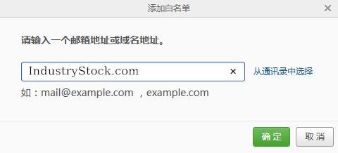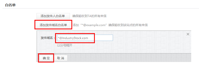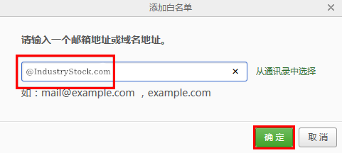 3、点击白名单内的”添加发件域名白名单”,在输入框中输入”*@IndustryStock.com”或者”IndustryStock.cn”,然后点击”确定”;