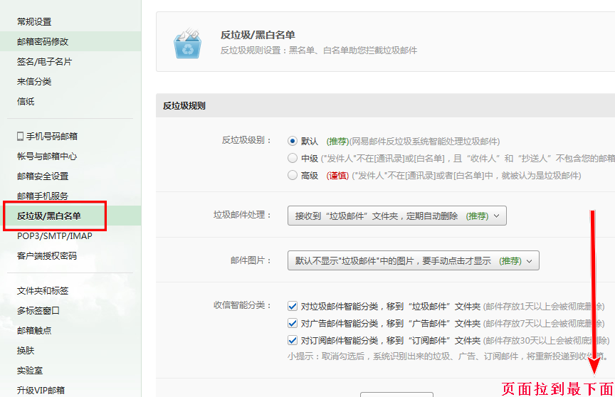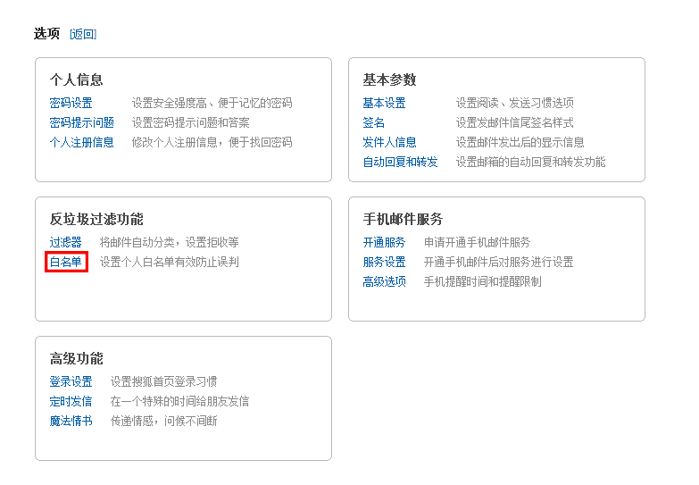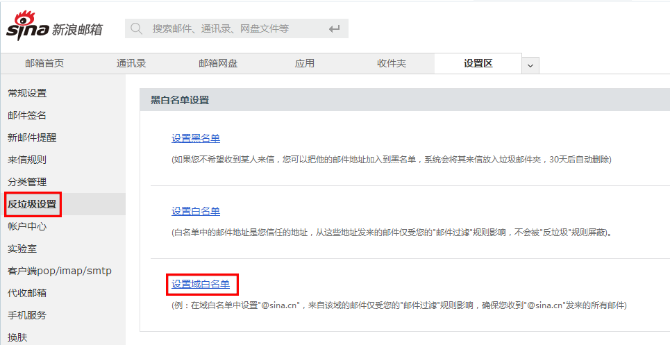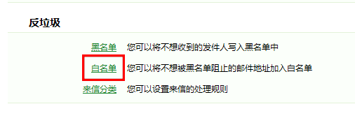 2、在邮箱设置-反垃圾中点击”白名单”;