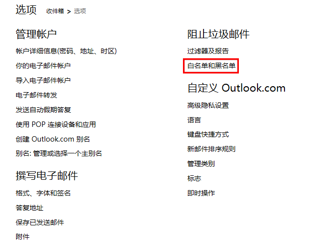 2、在Hotmail选项中点击”阻止垃圾邮件-白名单和黑名单”;