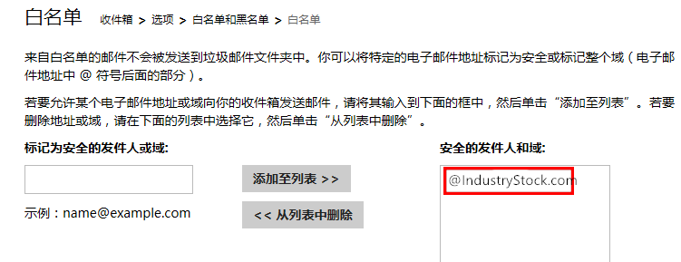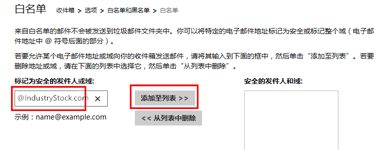 4、在标记为安全的发件人或域的输入框内输入”@IndustryStock.com”或者”IndustryStock.cn”后点击”添加至列表”;