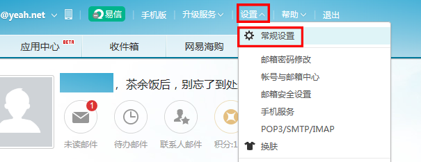 1、登录您的yeah邮箱,点击邮箱页面右上方的设置-常规邮箱;