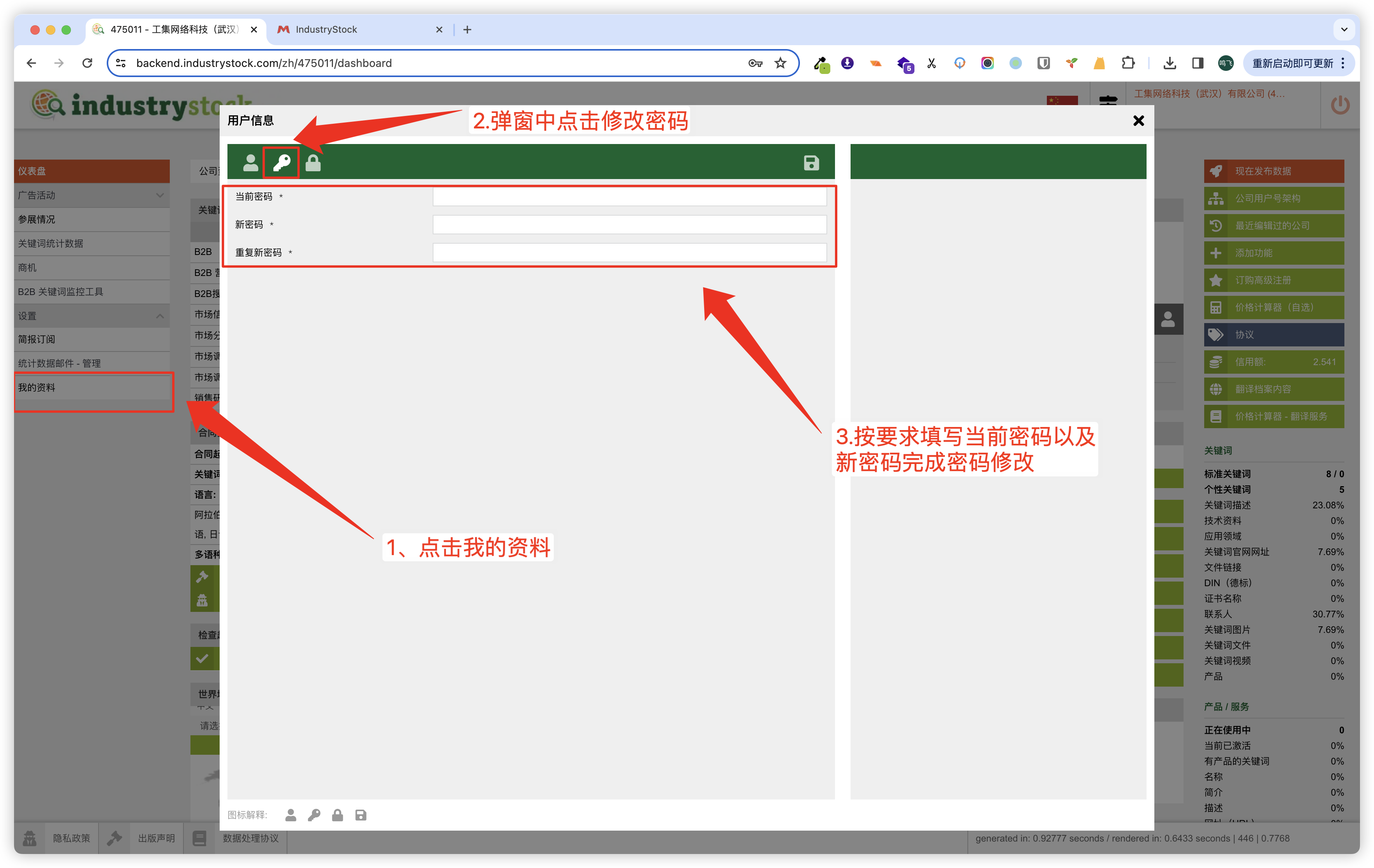 登陆后台后,点击左侧《我的资料》——《修改密码》输入当前密码以及新密码进行密码修改